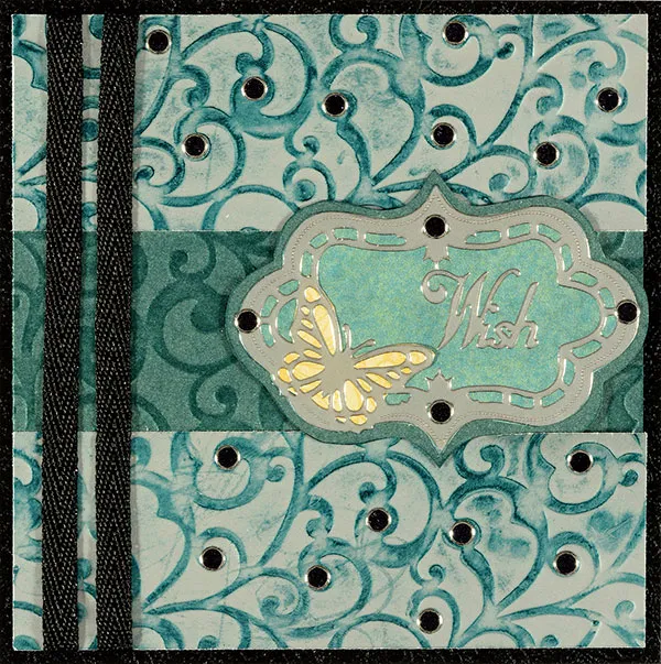 Use the Texturz Silicone Rubber Mat and the All Over Swirls stencil with your die cutting machine to emboss a 4¾”x3¼” Silver Metallic paper and a 4¾”x2½” Emerald Glimmer paper. Lightly swipe the ink pad over the surface so it colors just the raised areas on both papers. Glue the Emerald Glimmer paper centered. Cut the Silver Metallic paper in half. Glue one piece 1/8” from the top, and the other piece, 1/8” from the bottom, over the Emerald Glimmer paper. Glue two metallic black ribbons on the left side, tucking the ends under the papers.