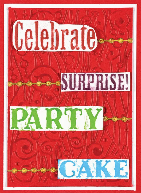 TECHNIQUE: Isolate words from the embossing folder. Use the Birthday Words embossing folder to emboss a 4¼”x6” white cardstock. Find the words you want (saving “Happy Birthday” for the inside), and cut them from the piece. Using a different color of ink for each word, lightly ink the raised area. Cut close to the raised image, and foam tape to the card front. Place a Jewel Border Dazzles™ extending from each word as shown.