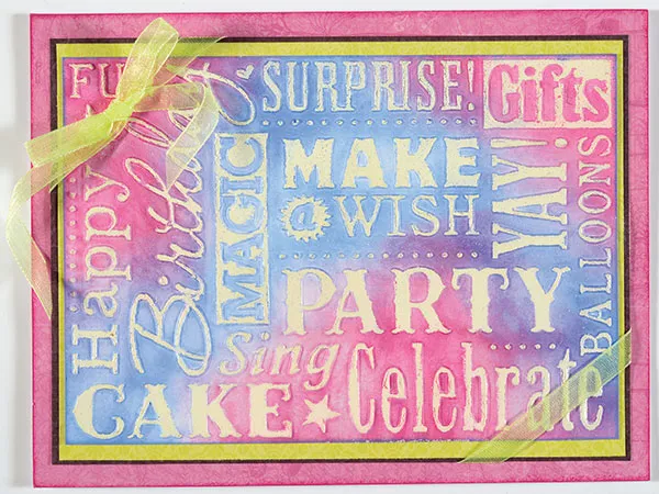 Place 6¼”x4¼” white cardstock in the embossing folder and follow your die cutting machine manufacturer's instructions to emboss the piece. Brayer VersaMark™ over the embossed words. Dust with embossing powder and set with the heat gun. Use the stylus to apply Berrylicious ink to random areas of the piece. Wipe the ink from the embossed words with a wipe. Repeat the process with Periwinkle ink on the remaining areas, blending the colors where they meet. Wipe the ink from the embossed words with a wipe.