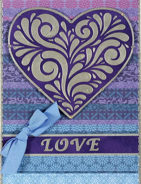 Position the stencil with the large heart image near a corner of the violet suede. Tape the stencil in place. Use the mini squeegee to spread an even layer of Metallic Silver Embossing paste over the heart portion of the stencil, including the thin outer border. Carefully lift the tape and stencil from the violet suede. Wash the stencil and squeegee immediately. Let the stenciled heart dry. Cut out the heart around the outer edges of the thin silver border. Foam tape it centered on the card, 1/4" from the top.