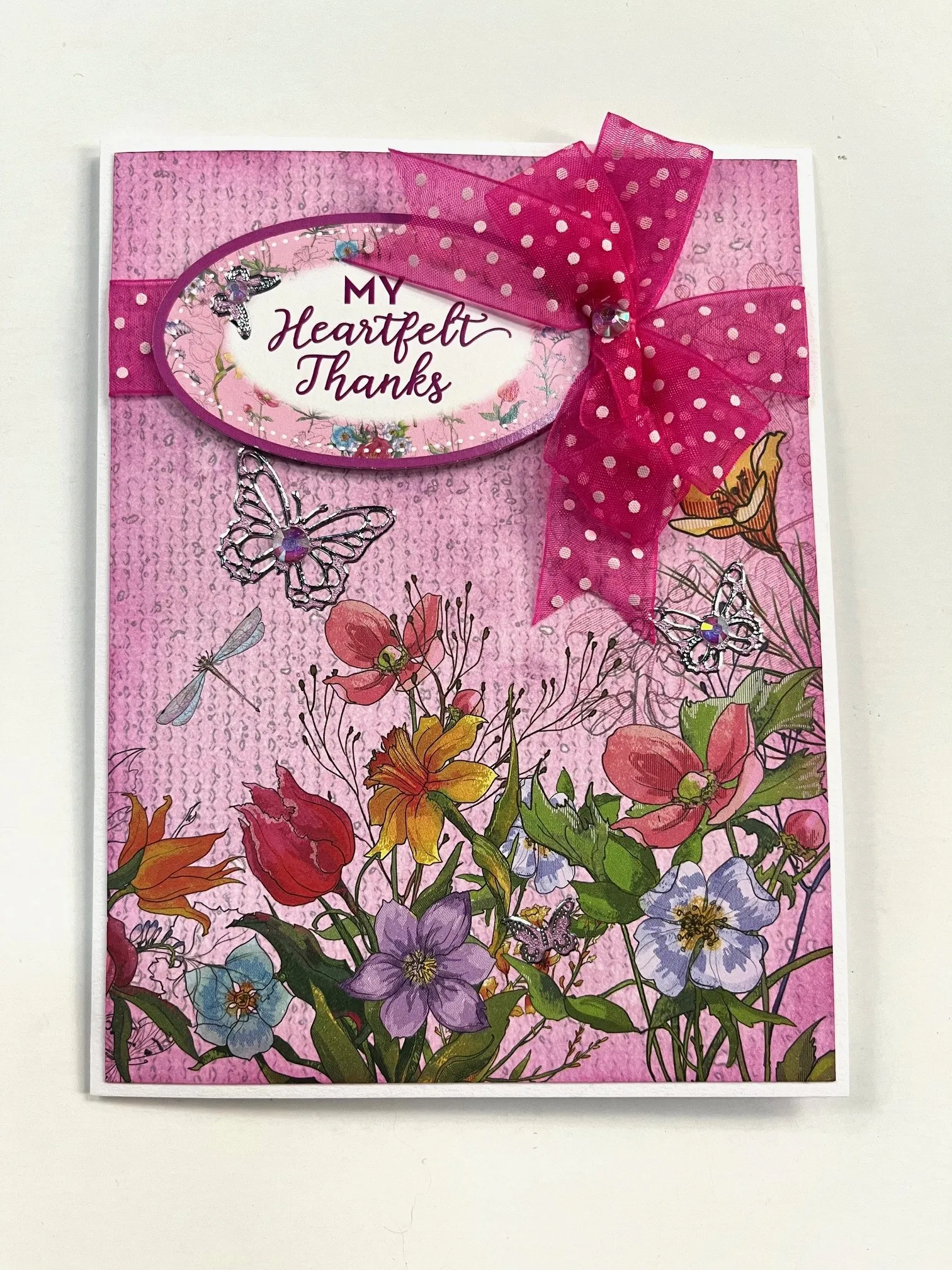 2. Foam tape the “my heartfelt thanks” die-cut to the ribbon, ⅜" from the left card edge. Make a 4-loop bow with the same ribbon, tie the center with thread, then glue it just right of the greeting. Place pink pearl butterfly Dazzles™ among the flowers and a small one on the greeting. Glue a Crystalz to each butterfly’s body and one to the bow center.