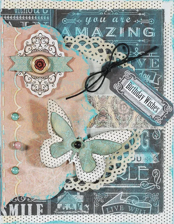 Inside: Cut a 5”x1” pink/tan/aqua floral paper and sand the edges. Glue centered across the inside. Use the Design Tool kit #6 tag shape to trace a tag from pink scuffed paper, then cut it out. Add Broken China ink to the edges and let dry. Wrap remaining black cording angled across the top of the tag, anchoring with an Embellies™ brad. Secure the ends to the back of the tag with glue. Glue the tag overlapping the left side of the paper.