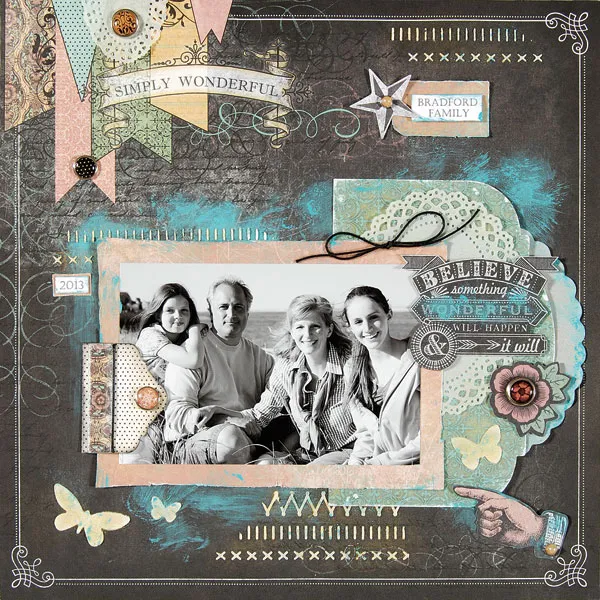 Cut out “Believe something wonderful will happen & it will” from Chalkboard words patterned paper. Dab some Broken China paint over “wonderful” and let dry. Foam tape to the right side of the page, overlapping the right side of the matted photo and die-cuts.