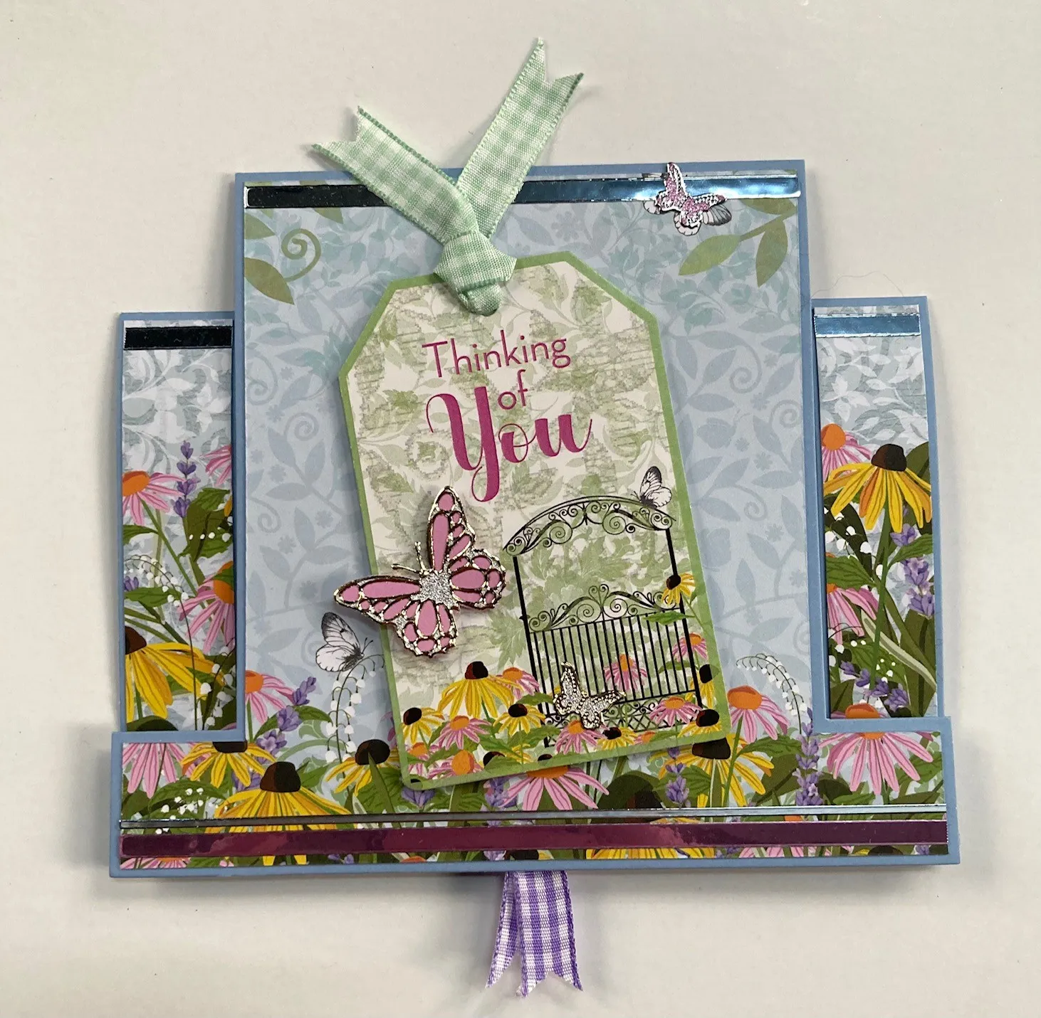 2. Cut two ¾"x3¾" Secret Garden blue border cardstocks, place silver straight line Dazzles™ to match the front near the top edge, and trim the excess. Glue the cardstocks to the side panels. Attach a mint gingham ribbon to the “thinking of you” tag die-cut and foam tape it to the front, angled as shown. Back a 1⅛" silver pearl butterfly Dazzles™ with pink cardstock, then foam tape it to the tag and place two tiny butterfly Dazzles™ as shown.