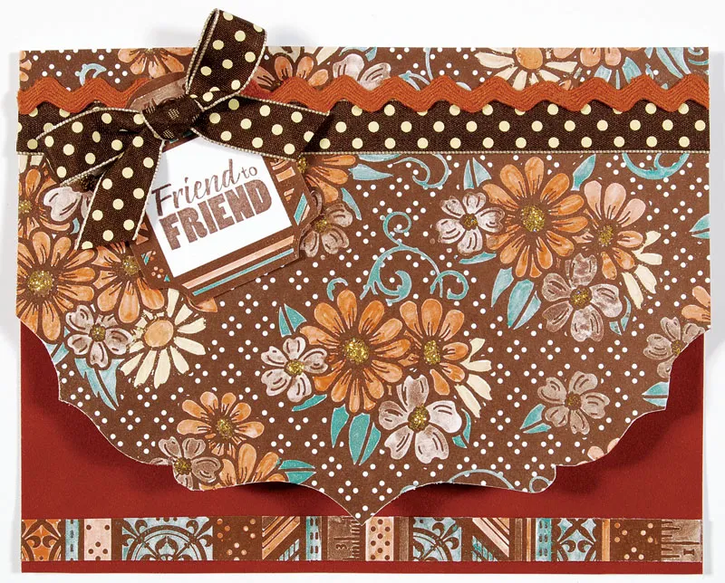 Glue a length of brown dot ribbon across the card top, 1/2” from the fold. Glue a length of sienna rick rack across the top edge of the ribbon. Stamp the small tag with a greeting and blue to the left side of the ribbon. Glue a brown dot bow to the top of the tag.