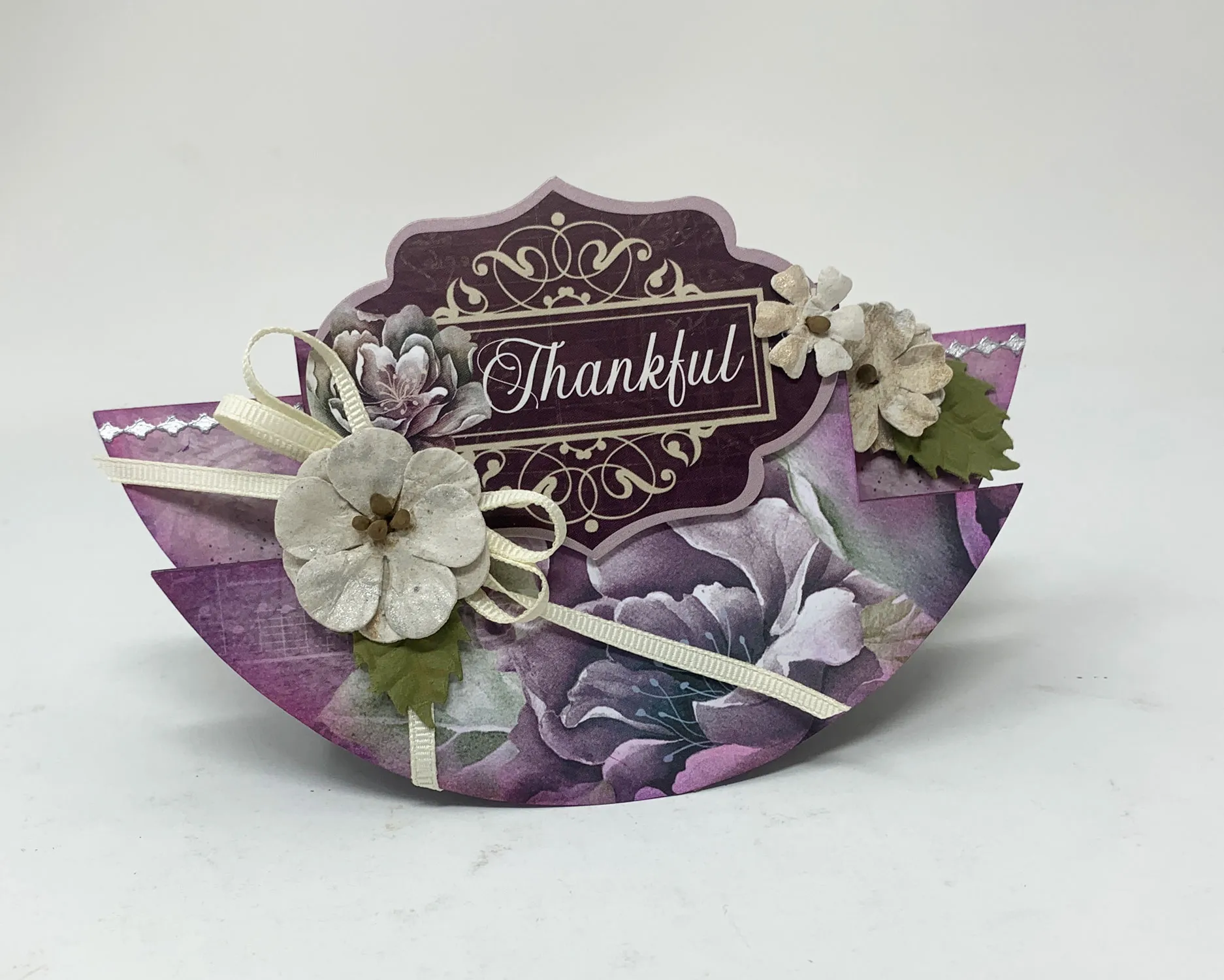 2. Trace and cut the side paper patterns from Abundant Florals light purple paper and ink the edges as before. Glue the papers to the appropriate side step panel. Place silver thin line Dazzles™ near the upper edge of both side panels, trimming the excess. Foam tape the “thankful” label die-cut to the upper front, extending ¾" from the upper edge.