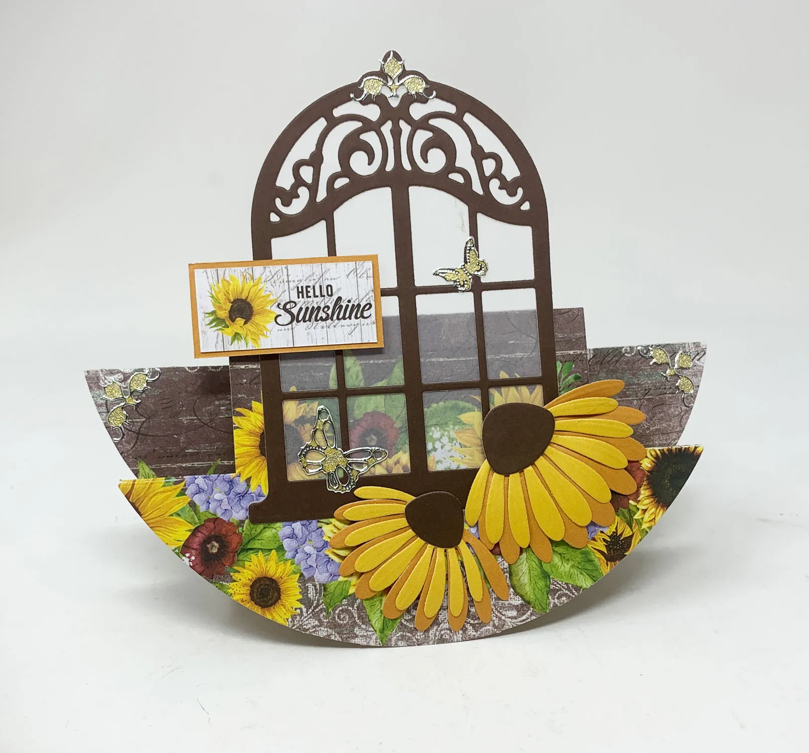 2. Die cut the window frame from brown solid cardstock and the solid outer window from vellum. Glue vellum behind the frame. Glue the window to the card front so it extends 2¼" above the top edge. Cut out the Sunflowers “hello sunshine” label and mat it on gold cardstock with 1/16” borders. Foam tape it to the window as shown.