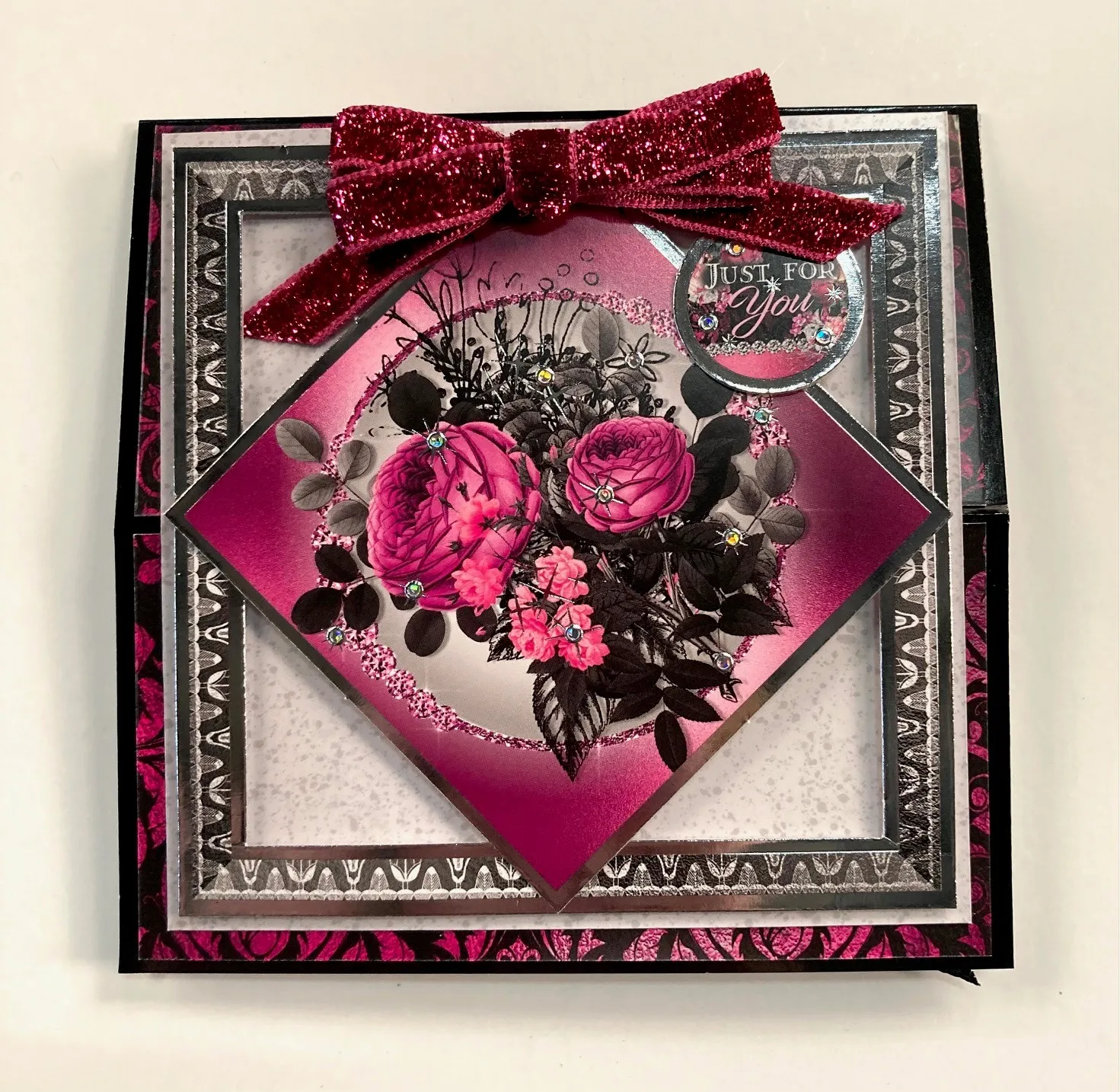 Cut 4 3/4" square Patterned Adorable Scorable from the "Radiant Roses" collection then cut in half. Glue each half to one side of the easel leaving a 1/8" black border. Cut the speckled section of the Foiled Adorable Scorable to 4 3/8" square. Foam tape the large square frame Topper leaving a 1/16" speckled border. Foam tape the rose Topper to the frame on point. Foam tape the "Just for you" Topper to the top right. Make and Zot™️ a 2 1/2" wide pink bow at the top. Place silver Jewel Dazzles™️ stickers as shown. Attach with Tape Runner only the bottom half to the bottom section of the card leaving a 1/8" patterned Adorable Scorable border.
