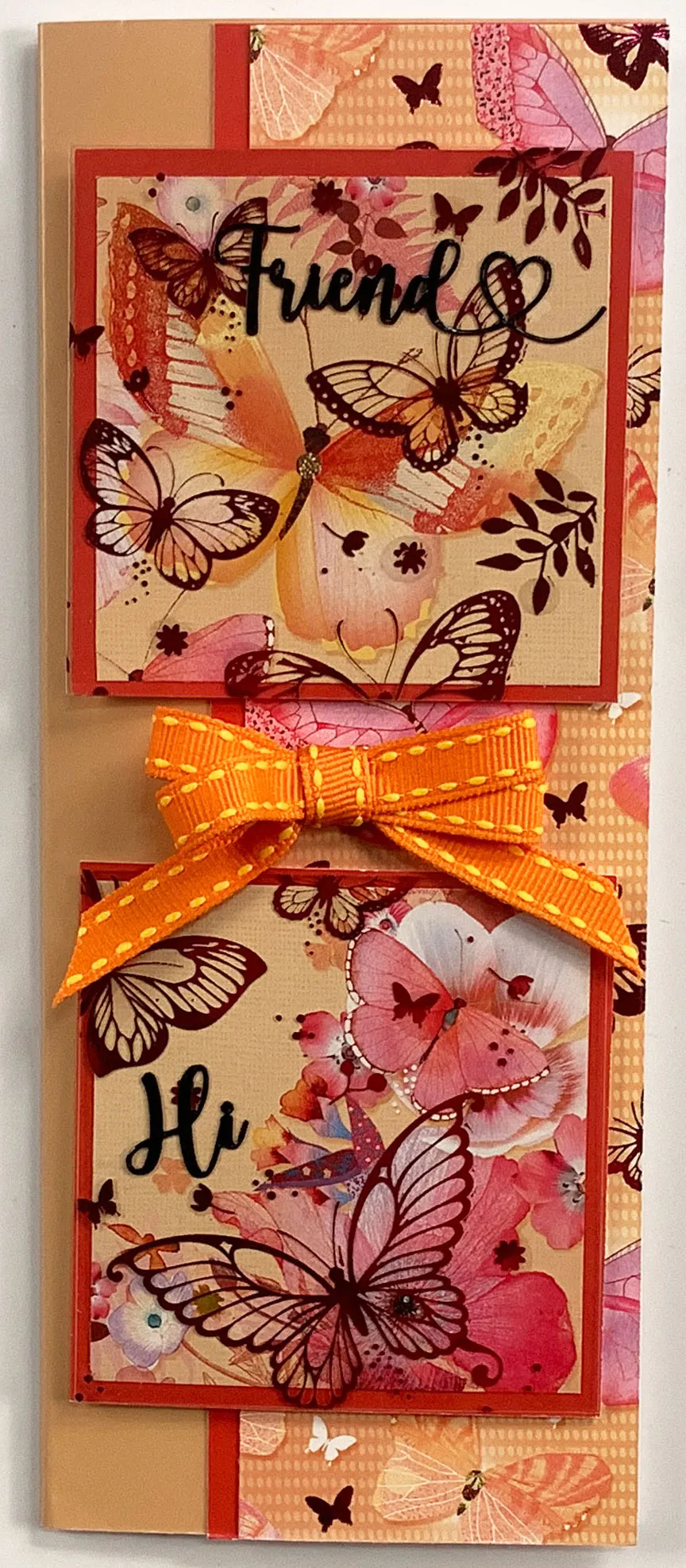 Cut 7"x8 1/2" tan Adorable Scorable. Score in half from the long side and fold to make a slim line 3 ½”x8 ½” card. Cut 2 ¼”x8 ½” of orange Edge-to-Edge cardstock. Cut 1/2"x8 1/2" of orange Adorable Scorable and glue this to the left side of the Edge-to Edge cardstock. Glue flush to the right side of the card front. Cut two 3"squares of orange Adorable Scorable. Cut two 2 ¾” square butterfly pieces from the Paper Pad and glue to the squares leaving a 1/8" orange border. Cut two 3" squares of the butterfly acetate and glue over top by placing glue behind the acetate butterflies. Foam tape ¾” from the top and another ¾” from the bottom of the card. Zot™️ a 2" wide bow between them. Place “Friend” and “Hi” Dazzles™ as shown.