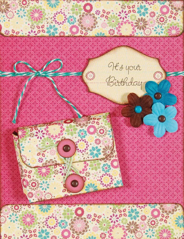 Write or computer print “It’s your birthday” on the yellow side of the yellow grid/green tiles paper then use the template to trace a pint-sized label around the words. Cut out the label and ink the edges. Foam tape over the right side of the twine. Add brads to the centers of the small silk flowers and Zot near the label.