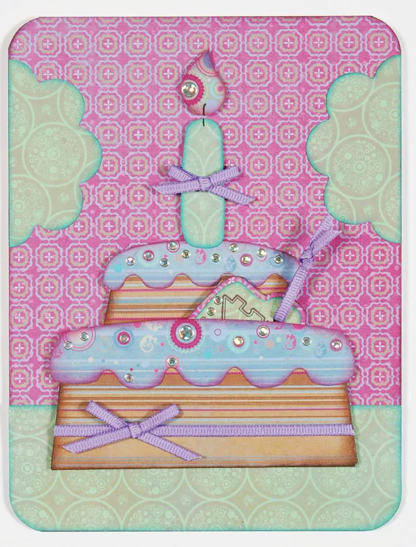 Add Jewel Dazzles™ to your tag, frosting and the candle flame. Zot™ a small bow to the candle. Use Zips™ adhesive lines to adhere ribbon across the bottom layer of your cake, and use Zots™ adhesive dots to attach a bow on the left side.