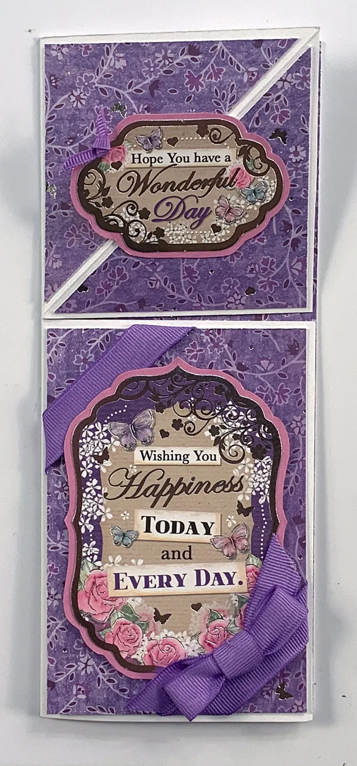 Mat “Wonderful day” and “Wishing you. . ” toppers on lavender Matt-tastic Adorable Scorable leaving 1/16” lavender borders. Foam tape the largest Topper to the bottom section and Zot™ a 2” bow as shown. Glue the smaller topper to the top section only attaching the bottom right to the bottom right triangle. Zot™ knotted ribbon as shown.