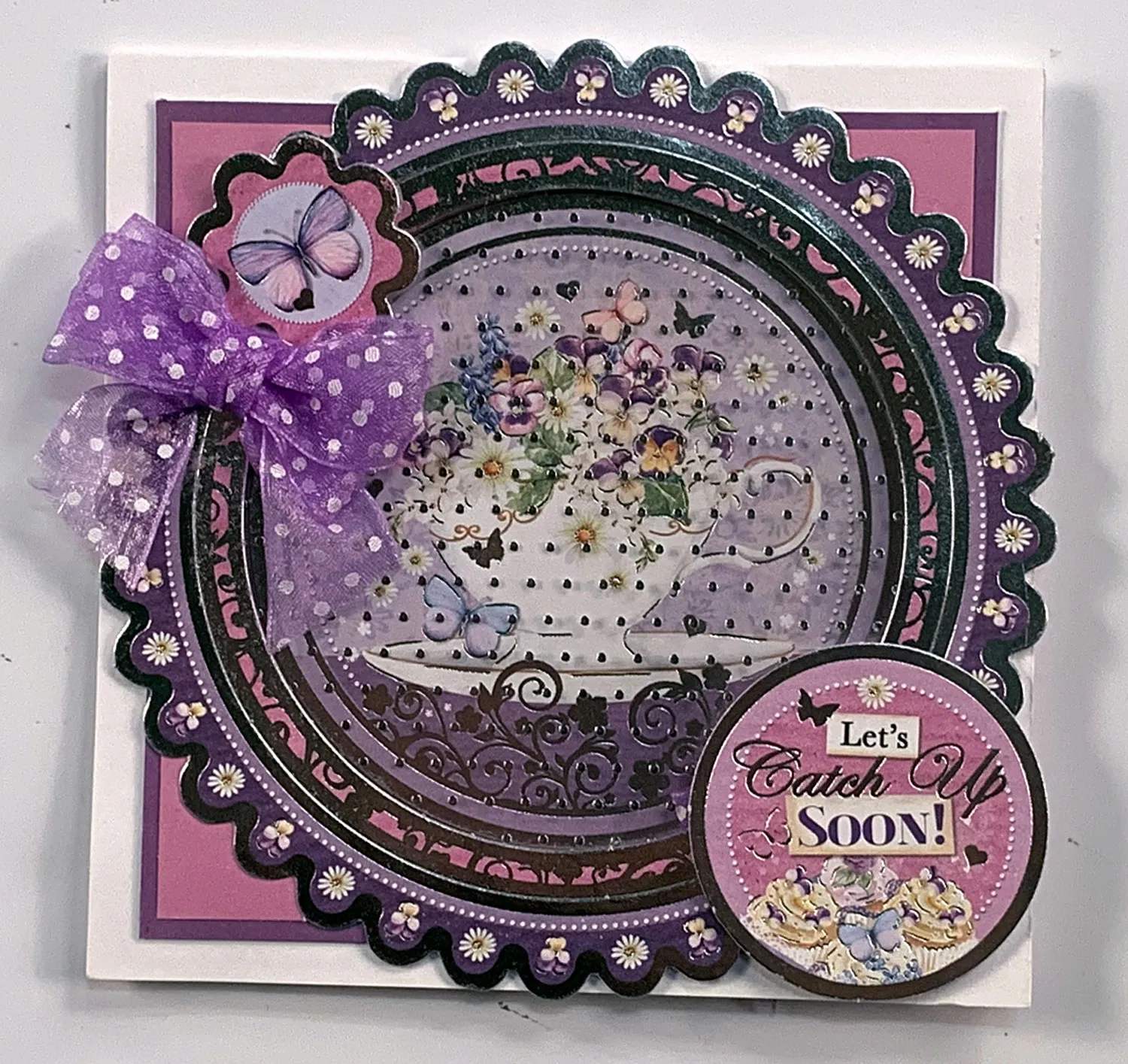 Cut the card to a 5” square. Cut 4 1/4” square of pink Matt-tastic Adorable Scorable and also out of the dots Luxury Foiled Acetate. Mat the pink square on purple Matt-tastic Adorable Scorable with 1/8” borders. Lightly glue just the edges to the card front. Die cut a 3 ¾” wide circle using the 12 Circle & Scallop Dies. Lift off the Adorable Scorable and glue the dots acetate to the card covering the empty circle. Re-glue the Adorable Scorable leaving a 1/4” white border. Glue the large outer and inner frame from the tea cup Topper around the circle. Tip: Check the back on the inside to make sure it’s straight. Foam tape the smaller Toppers along the frame and Zot™ a 2” wide bow as shown.