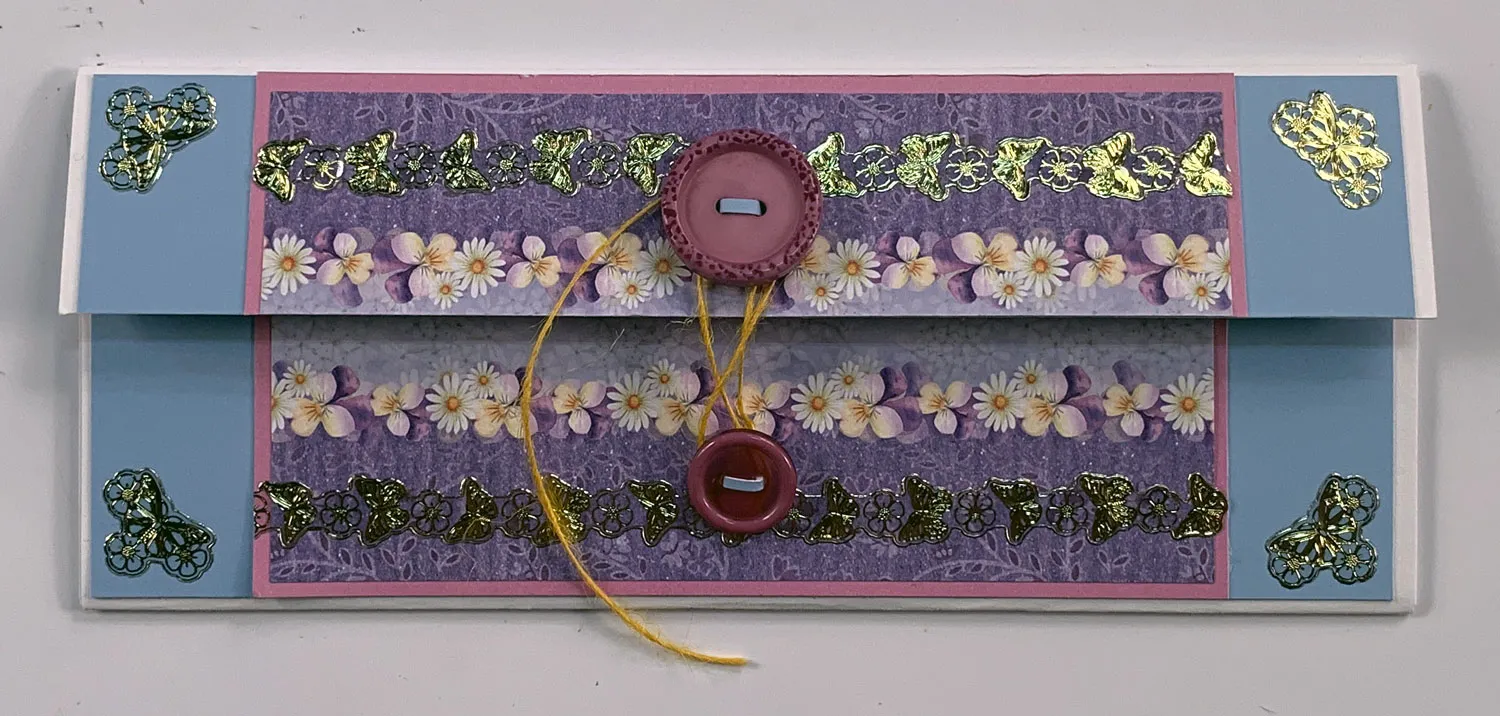 Mat 6”x1 3/8” border paper on pink Matt-tastic with 1/8” borders. Glue to the center of the card top also keeping it flush to the opening edge. Repeat on the flap with 6”x3 ¼” border paper, matted on pink and glue to the center leaving 1” of light blue on both sides. Place Engraved Stickers and Everyday Greetings Dazzles™ to the front and bottom panels as shown.