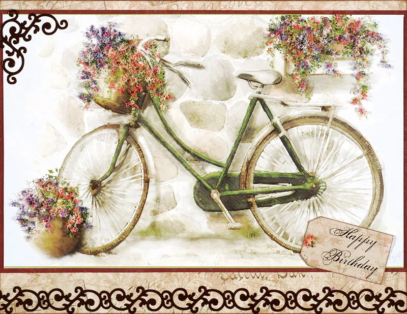 Place a Country bicycle Card Topper face up on your work area. Add small dots of glue to the areas of the flowers in the flower pots and basket on the bicycle that you would like to enhance (I added glue to some areas of the flowers, but didn’t cover all of them), then add the Fuchsia Flower Soft over the glue. Tap off the excess and let dry. Repeat for the remaining areas using Summer flower soft instead of Fuchsia. Let dry.
