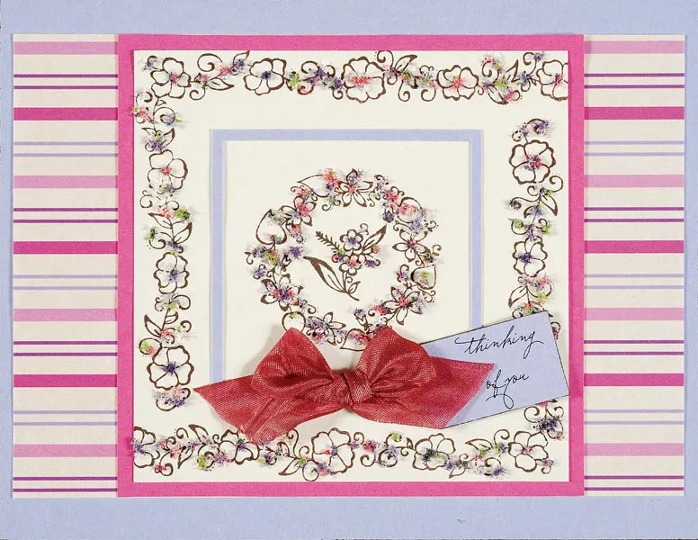 Cut a 4” ivory cardstock square and stamp the center with the floral wreath image. Stamp the floral border image around the outside edges as shown. Stamp the small floral motif centered inside the wreath. Mat on pink cardstock, leaving a 1/8” border. Glue centered over the striped paper on the card front. For the lavender frame, cut a 2 ½” lavender square. Cut a 2 ¼” lavender square and place it centered on the larger square. Trace around the smaller square with a pencil, then remove it and cut out the drawn square. Glue the resulting frame to the stamped ivory square, with the stamped wreath at the center of the frame.