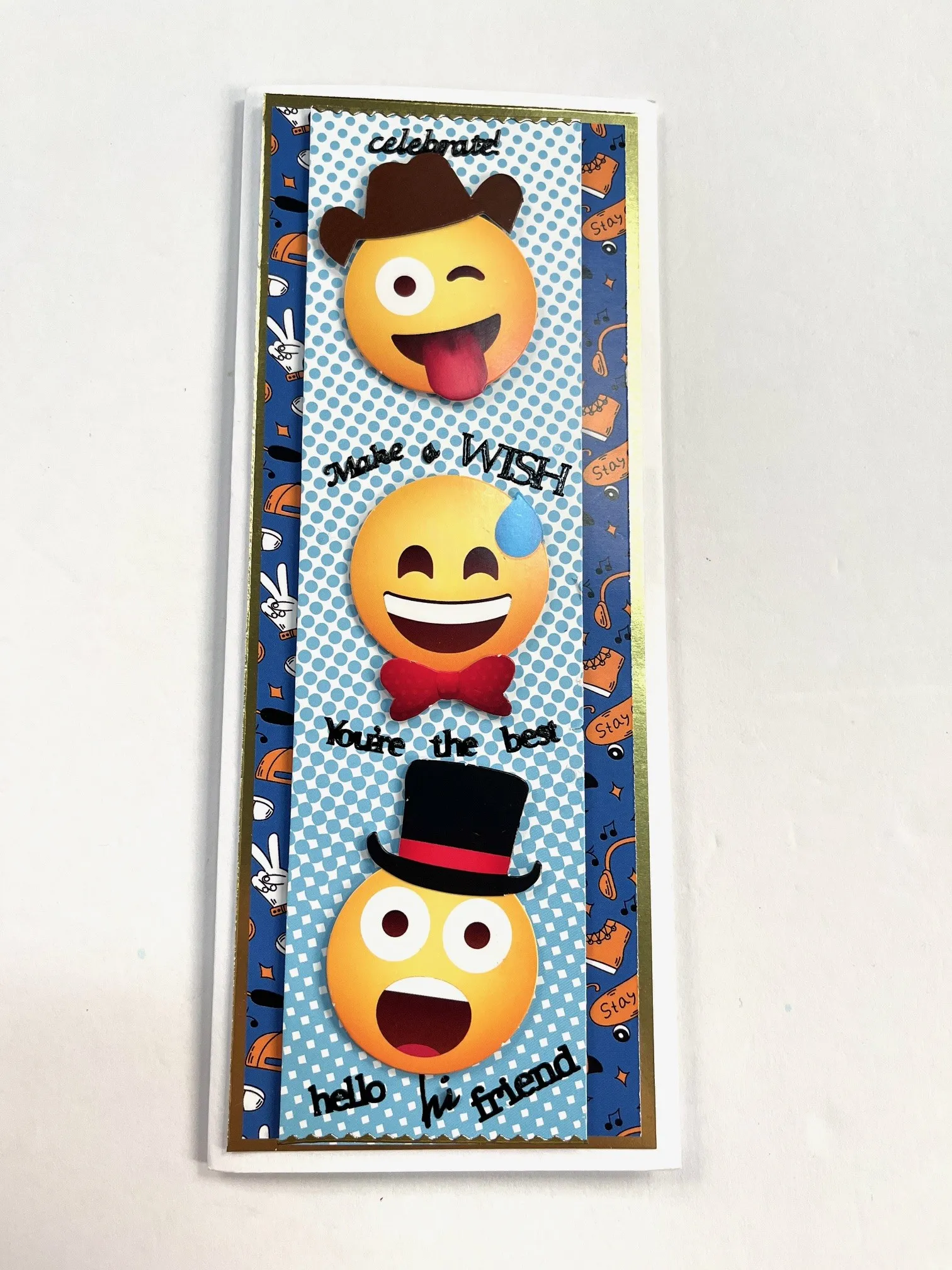 Place a slim line card with the fold on the left. Cut 2 7/8”x7 7/8” piece of “Stay Cool” paper from the 8x8 paper pad and mat on the metallic gold cardstock leaving 1/8” gold borders. Foam tape 2 1/4”x7 7/8” strip of blue dots paper on top. Foam tape the die-cuts as shown and place Tiny Words and Phrases Dazzles™️ between them. Place Gold Thin Line Dazzles™️ at the top and bottom of the strip.