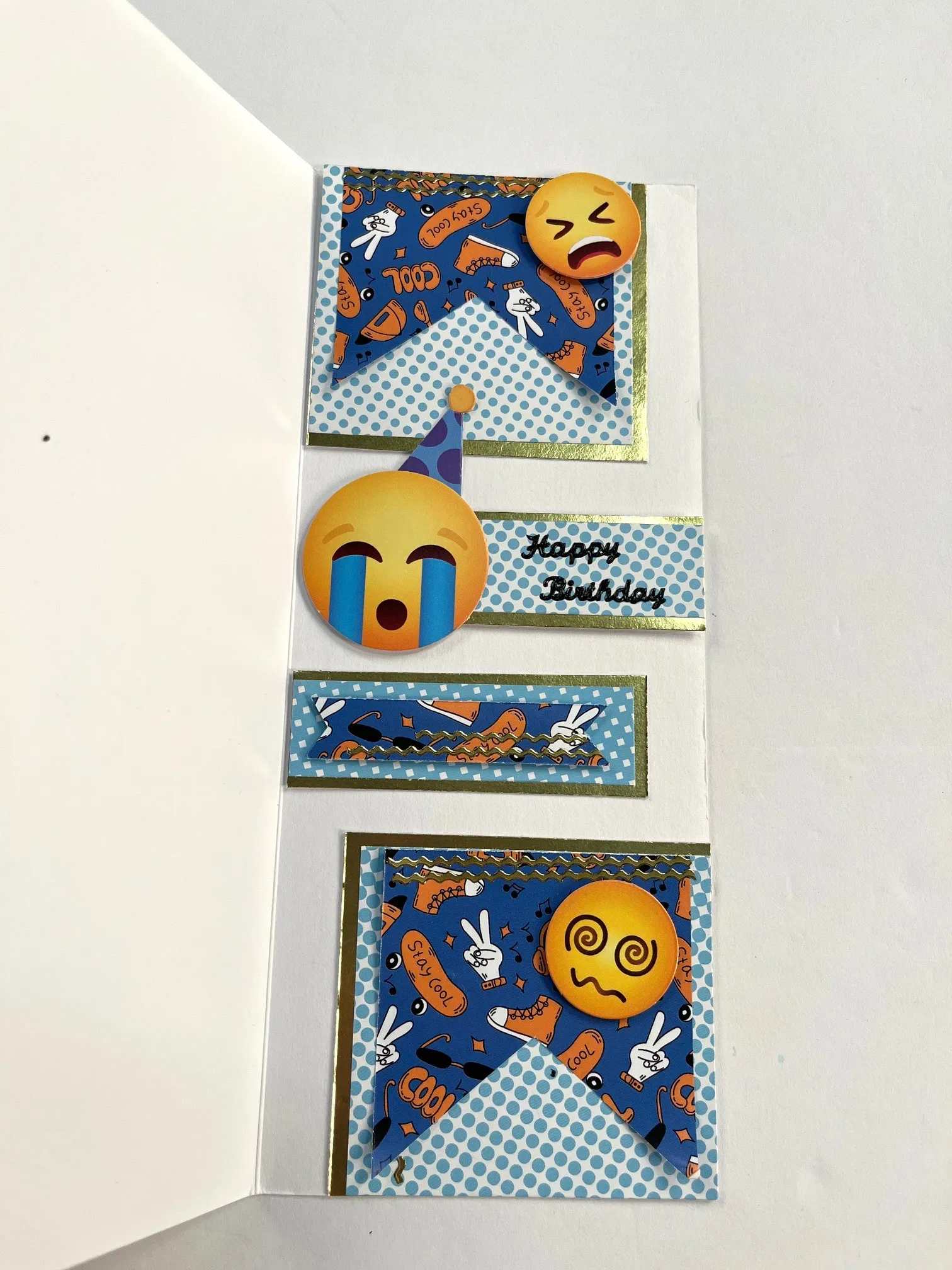 Card inside: Cut 2 3/4”x2 1/2” blue dots paper and mat on metallic gold cardstock flush to the left and top. Repeat with a second pair but attaching to the bottom and right side. Glue at the top and bottom of the card.