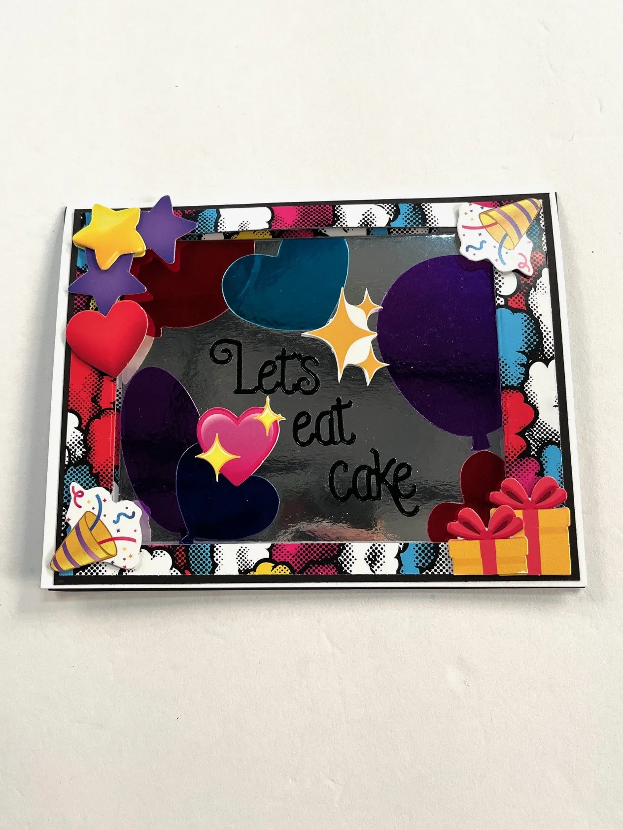 Card Inside: Cover the inside edges with tape, place black cardstock flush to fold and one side, turn over and trim off the excess. Die-cut digital clouds with the 5 ¼” wide scallop die. Tape in the center so it shows through the window. On the silver piece wrap balloon Dazzles™ over the edges. Tape so it fits back into the evacuated area. Place die-cuts and “Let’s eat cake” Dazzles™ as shown.