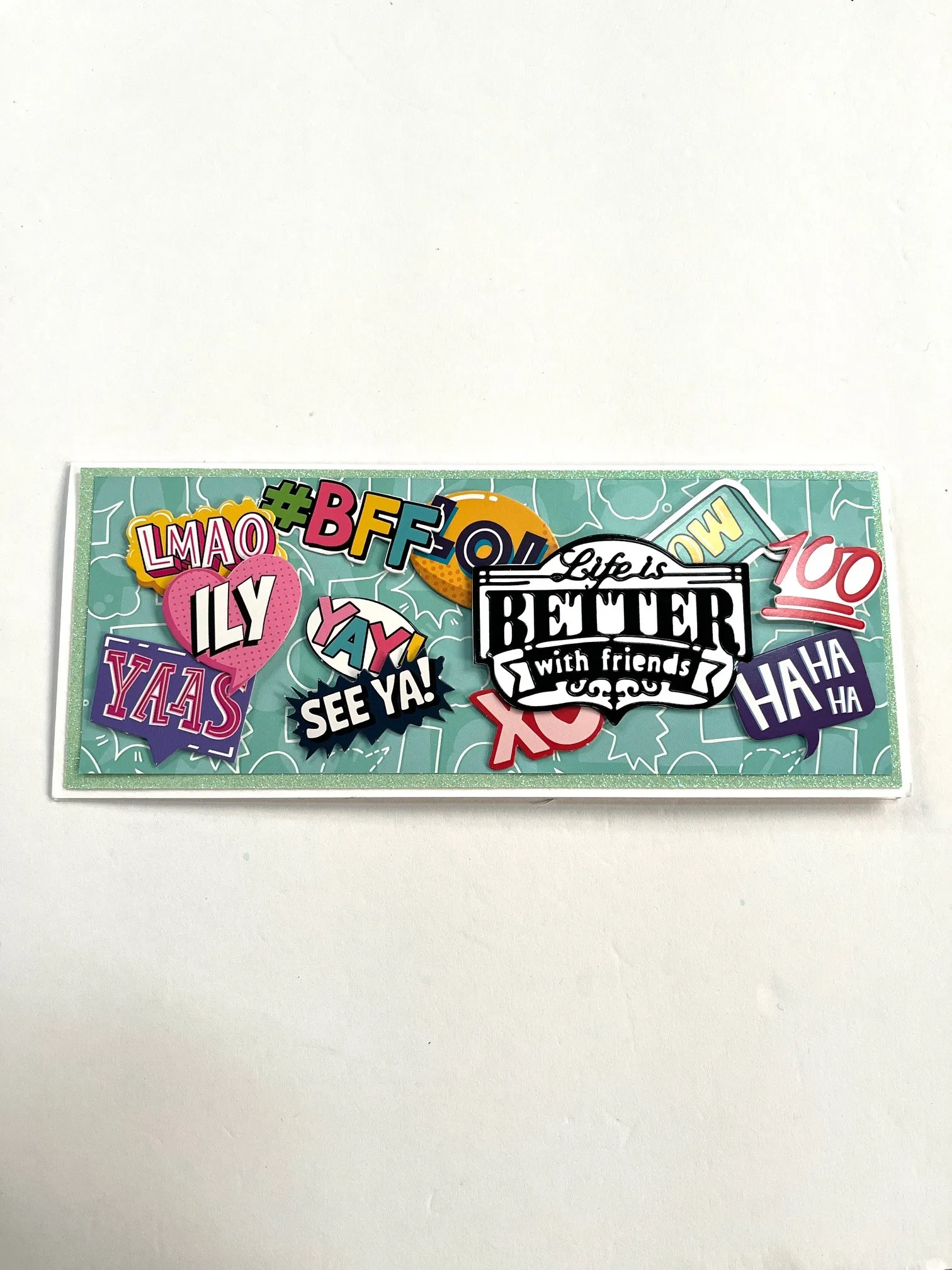 Place a slim line card with the fold at the top. Cut 8”x3” teal conversation bubbles paper from the paper pad and mat on Pistachio glitter cardstock leaving 1/8” borders. Tape to the card front. Foam tape Awesome Icons conversational die-cuts as shown. Place “Life is Better with friends” Big Greeting Dazzles™️ onto white cardstock, trim around the border, and foam tape as shown.