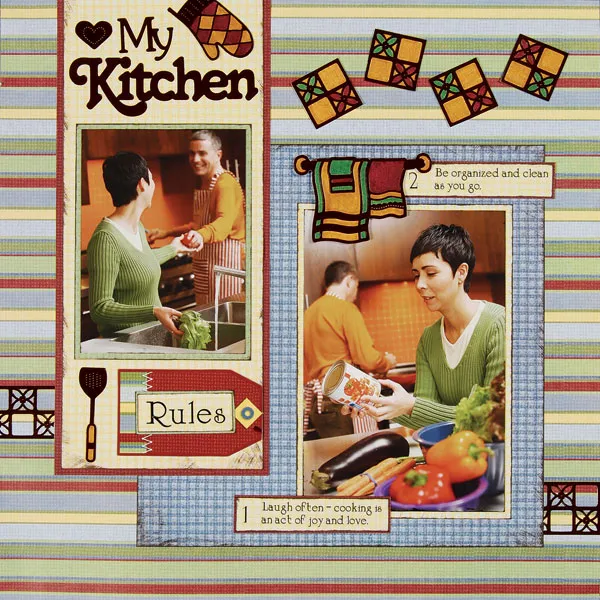 Apply "My Kitchen" Dazzles at the top of the yellow-checkered strip. Mat a smaller photo on green textured paper (1/8" border), ink the edges and attach below "My Kitchen." Attach the die-cut red tag at the bottom along the right edge of the strip. Journal "Rules" on yellow-checkered paper, ink the edges, mat on green with thin (1/16") border, ink the edges again, and attach over the tag.