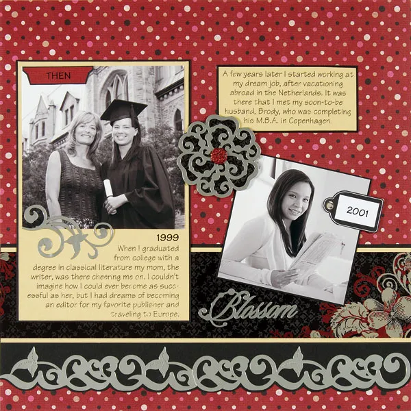 Mat smaller photos on black cardstock, leaving thin 1/16" matting. Attach one at an angle overlapping the black and silver foil strip on the left-hand page. Add a tag with journaling to the photo. Add "Blossom" Dazzle to black and silver foil strip beneath the photo. Journal on tan cardstock and mat on black. Attach to page above photo.
