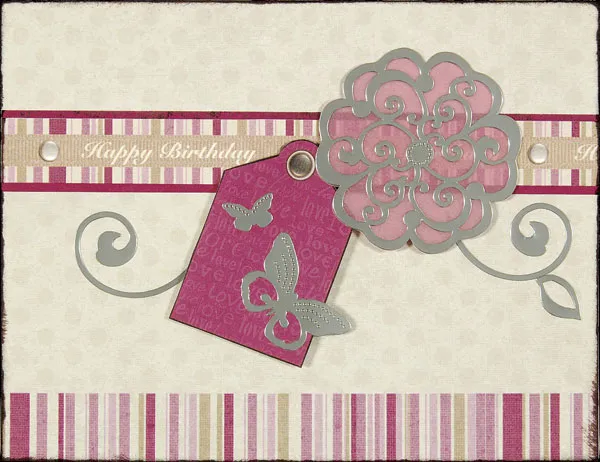 Apply butterfly Dazzles to magenta "Love" tag and foam tape along the "Happy Birthday" strip. Apply flower a Dazzle to pink vellum and trim around the outer edges. Attach along the "Happy Birthday" strip using a Zot at the center of the flower. Embellish by adding Dazzle swirls to the background paper.