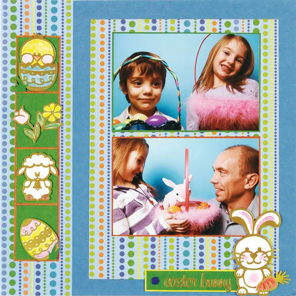 Foam tape large bunny and carrot to the bottom of the striped mat. Trim a strip of green paper and ink the edges. Mat with yellow paper and add Easter Bunny word stickers. Add a blue brad and foam tape the strip tucked under the bunny.