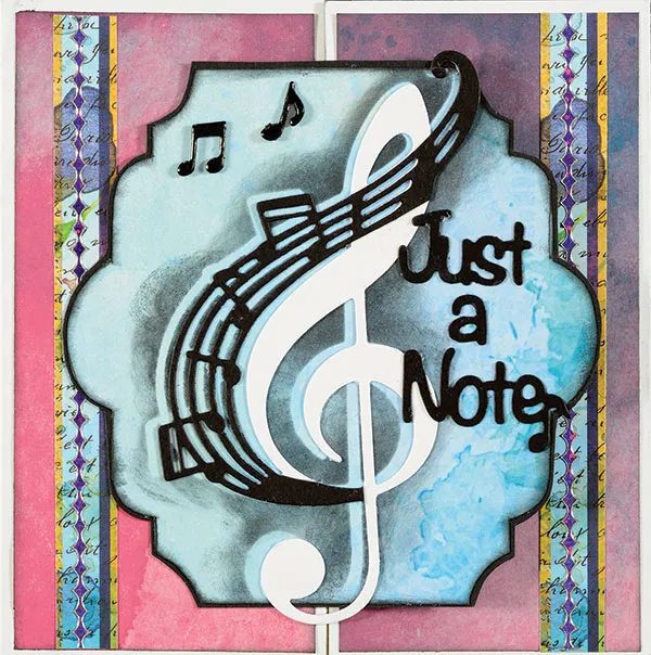 Inside: Cover the inside of the Frame Pop-Out Die-Cut card with Artful Watercolor Stripe paper, cutting around the die-cut frame opening with small scissors. Use the stylus and pad to apply black to the edges. Trace the card frame pop-out pattern onto Artful Watercolor blue paper and ink edges. Glue the frame to the card pop-out. Die-cut the Treble Clef die from scrap cardstock and place on the center of the frame. Use the stylus to apply ink over the image, using it as a stencil. Remove the die-cut and secure Music Note Brads and Inside/Outside Greetings Dazzles™ tiny hearts. Place “I Love You” Dazzles™ on the lower right and lengths of Purple Jewel Border Dazzles™ on the binding as shown.