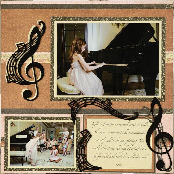 Use an On Butterfly Wings pink rosebud paper as your base. Mat a 12”x7” On Butterfly Wings brown dot paper on an On Butterfly Wings black border paper with ½” borders on the long edges. Glue a 12”x3/4” stripe with music notes from the On Butterfly Wings stripe paper, centered. Glue ¼” from the top. Glue a 12”x5/8” stripe with music notes 1¾” from the bottom.