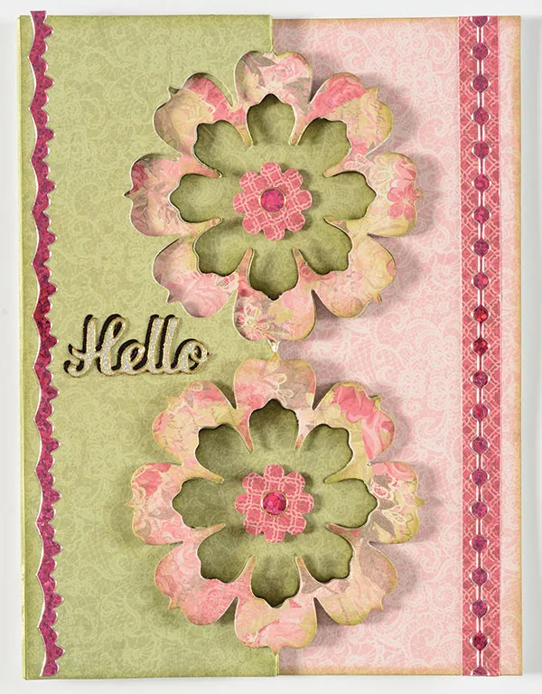 Die cut three large whole flowers from Roses and Lace rose paper. Glue one flower to the outside top flower. Fold on the score line. Foam tape the second flower to the bottom flower. Open the card front, and foam tape the third flower to the top flower. Place a pink jewel border Dazzles™ on the left edge. Layer a black and a pearl silver “Hello” Dazzles™. Place between the flowers on the left.