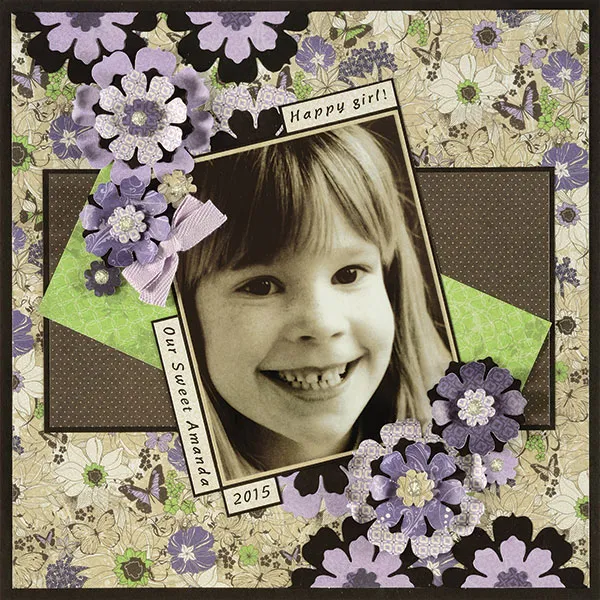 Background: Cut ½” from the top and right edges of Wildflowers all over floral paper and glue centered on 12”x12” black cardstock. Mat 10”x5” brown dot paper on black cardstock with a 1/8” border and glue centered on your page. Glue 9 ½”x4” green circle paper at an angle, as shown.
