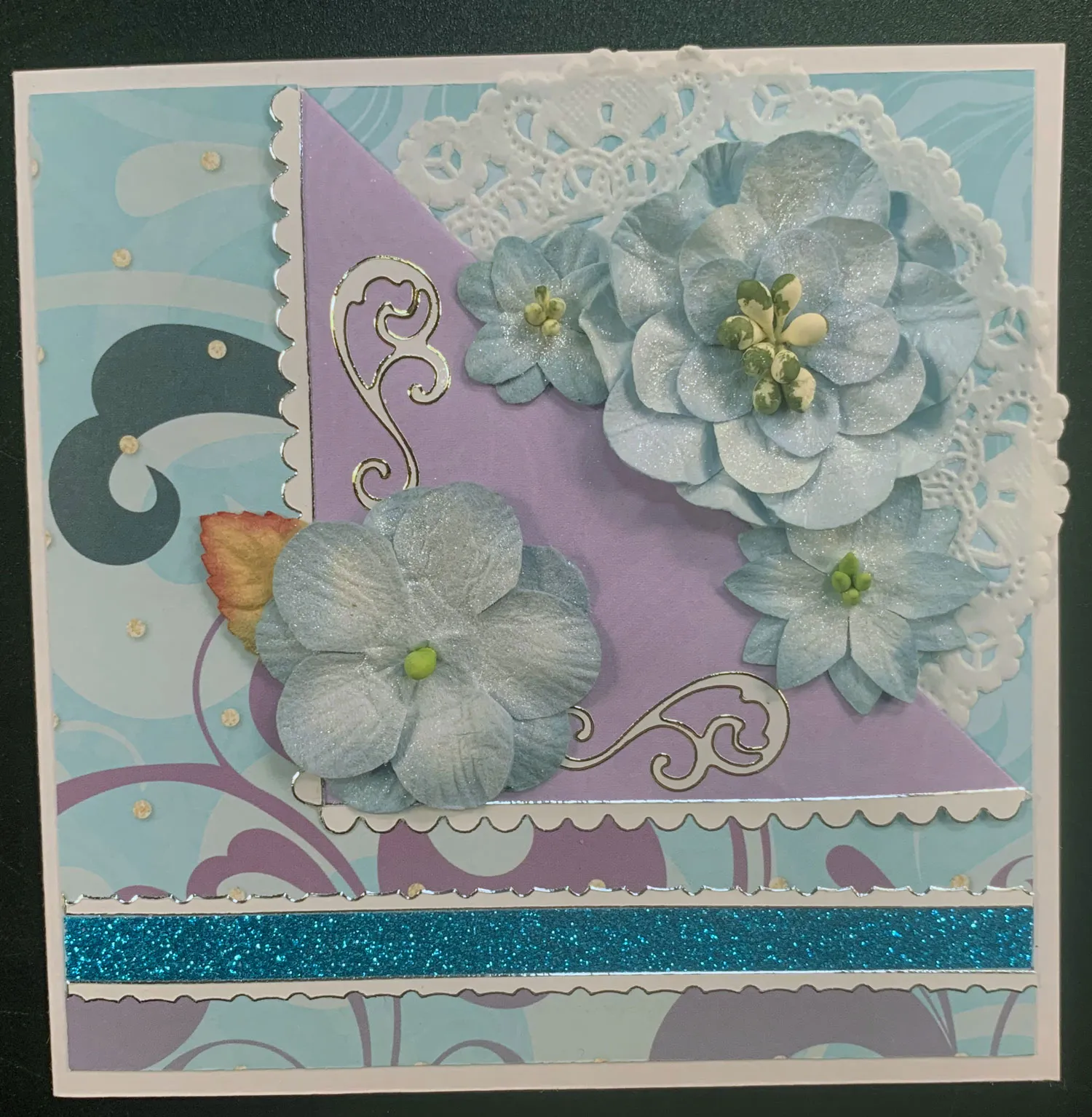 For the card front: Trim the card to 5"x5", then place it with the fold on the left. Cut 4"x4" Swirls Upon Twirls aqua swirls paper and glue it to the front corner, 1/8" from the top and right edges. Glue a doily on the paper, extending to the card edges.