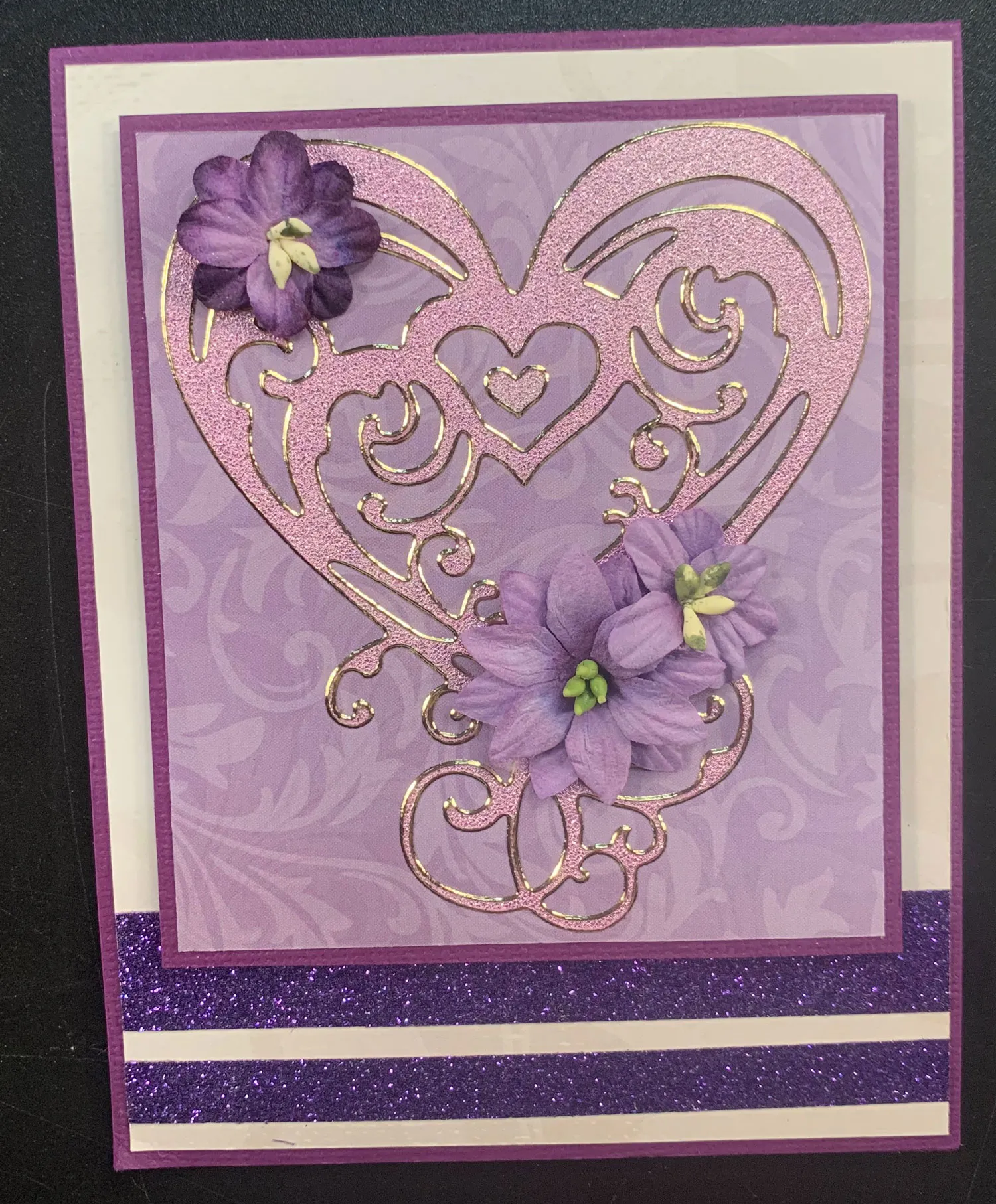 Cut 3¼"x3 5/8" Swirls Upon Twirls lavender swirls paper and mat it on purple cardstock with 1/8" borders. Place the 3"x3½" pink heart Dazzles™ on the paper, then foam tape the panel to the front, 1" from the bottom edge. Glue a 1¼" and two 1" flowers to the heart as shown. Open just the card front.