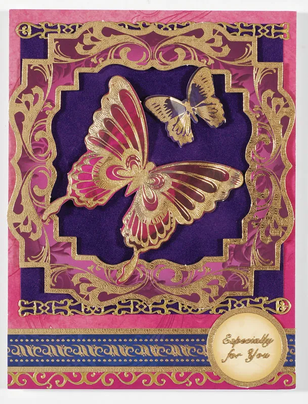Card Front: Place card with fold on the left. Cover with Butterfly Card Kit magenta swirl cardstock. Glue 4½”x5” Iris Suede paper centered and ¼” from the top. Place Gold Jewel Border Dazzles™ at the top and bottom of the Iris Suede paper as shown.