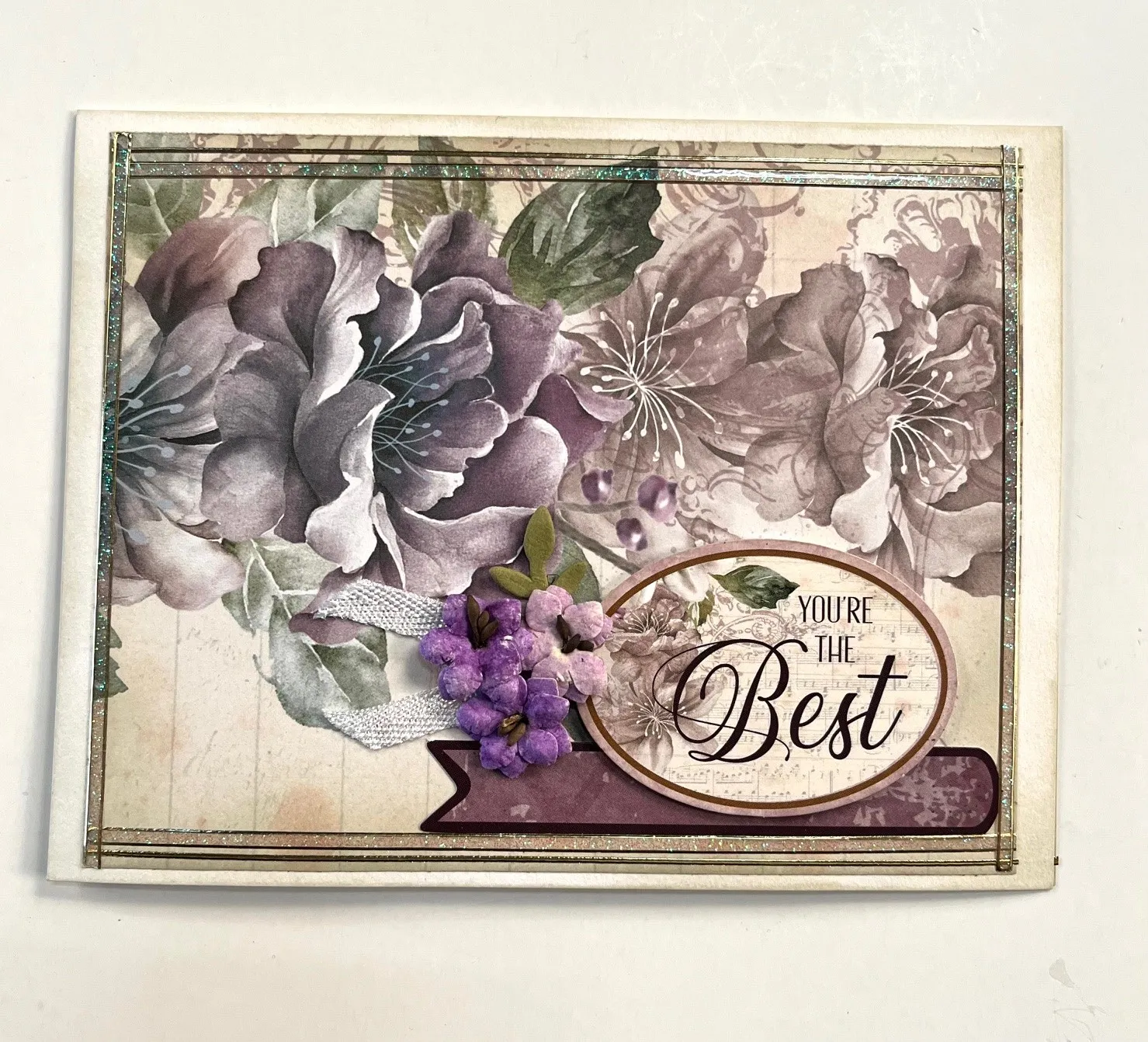 3. Glue the purple die-cut at the bottom right. Foam tape “You’re the Best” die-cut on top.