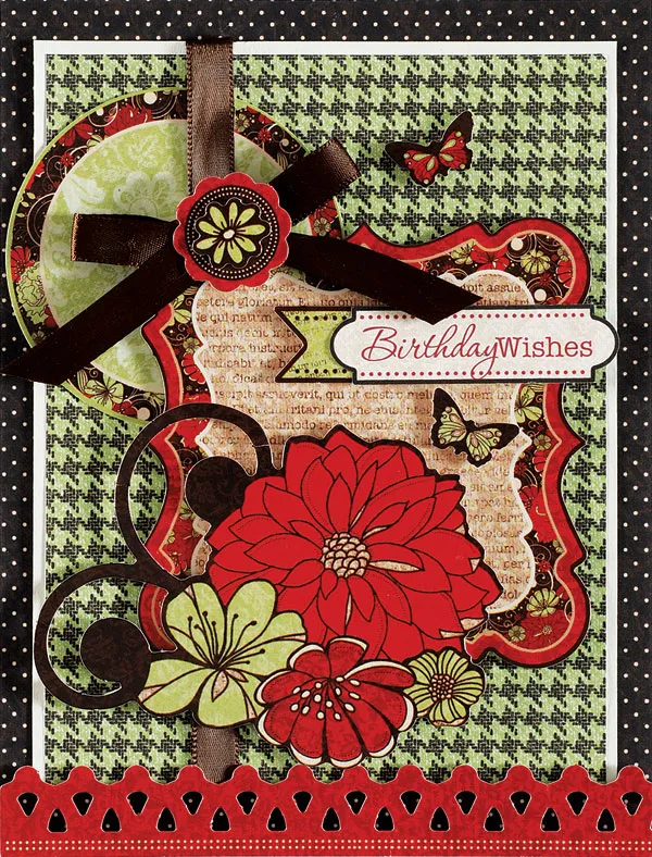 Place your card with the fold at the left. Cover the card front with dark brown dotted paper. Punch out the following die-cuts: green circle with floral border, scalloped square with tan text center, flowers with swirls, red scalloped button, tiny butterflies, tiny green flower, small green rectangular label, and red border.