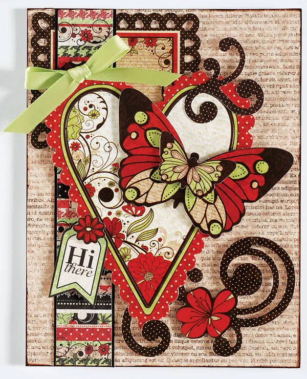Layer the small butterfly over the center of the large one with foam tape. Foam tape angled over the heart die-cut as shown. Cut out “Hi there” tag and foam tape angled over striped paper near the heart. Foam tape tiny red flower over top of tag. Tie a light green satin ribbon bow and Zot to the upper left edge of the heart die-cut.