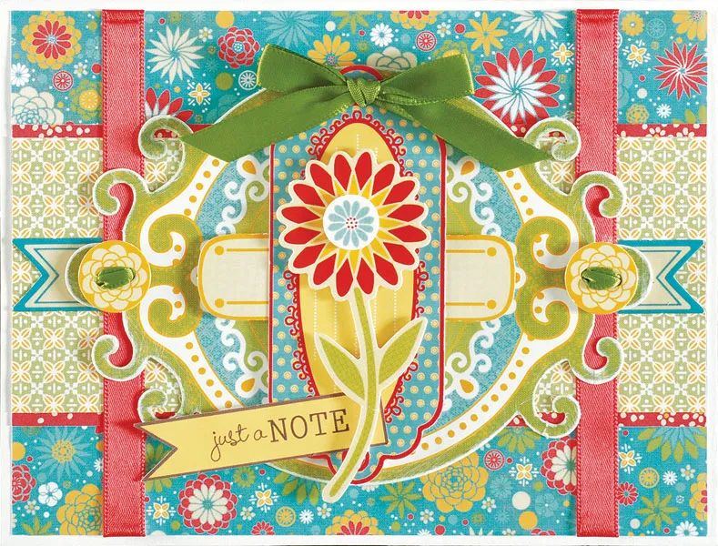 Cut out “just a NOTE” label and glue/foam tape angled over the bottom of the blue/yellow/red dotted label with oval center. Foam tape the red/yellow flower with stem overlapping the words label. Foam tape the tiny blue flower circle centered on the flower blossom. Tie a green satin bow and Zot near the top of the die-cuts.