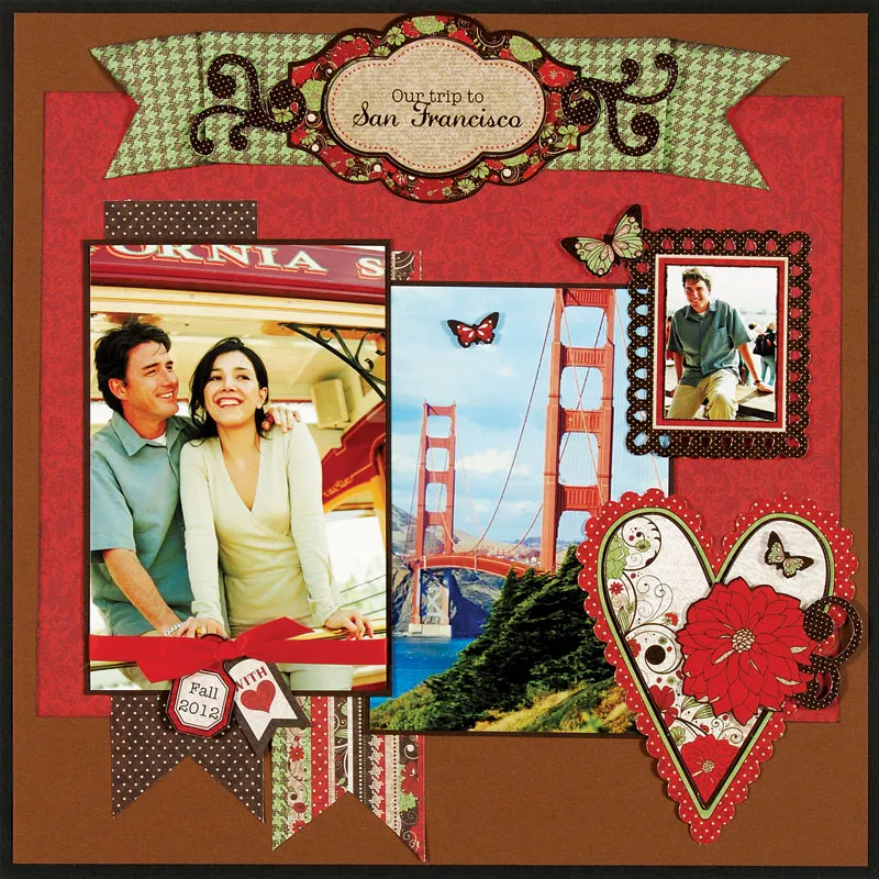 Journaling: Glue the floral scalloped frame die cut to the center of the houndstooth banner with a brown dot swirl die on each end. Write or print on the tan scalloped label die and foam tape to the center of the frame. Write or print on the tiny red tag die cut and Zotä,; along with a “with (heart)” tag cut out under the knotted ribbon on the photo. Glue and foam tape the large heart die cut to the bottom right corner of the center photo. Foam tape a large red flower extending off the right edge. Foam tape tiny butterfly die cuts to the heart and center photo.