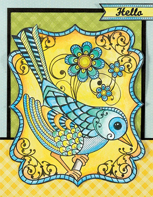Outline the inside edge of the label/bird, Feathered Friends For Colorists, with orange paint and then color the background yellow. Color the border blue. Color the perch with black and the bird with blue, green, yellow and orange. Cover the card with Hopscotch papers, as shown. Cut out the label/bird and glue to the card center. Paint the cut out flowers and label and foam tape to the card, as shown. Place “Hello” Black Tiny Words & Phrases Dazzles™ on the label.