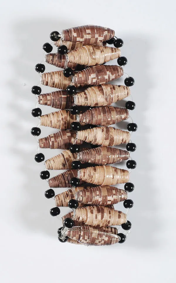 Finishing bracelet: When the last paper bead is used, check the bracelet sizing around your wrist. When you are satisfied with its fit, wrap each string end around the string between the first bead and the first black bead and tie an overhand knot. Repeat for the opposite side. Trim the string ends and add a touch of Diamond glaze to better secure knots.