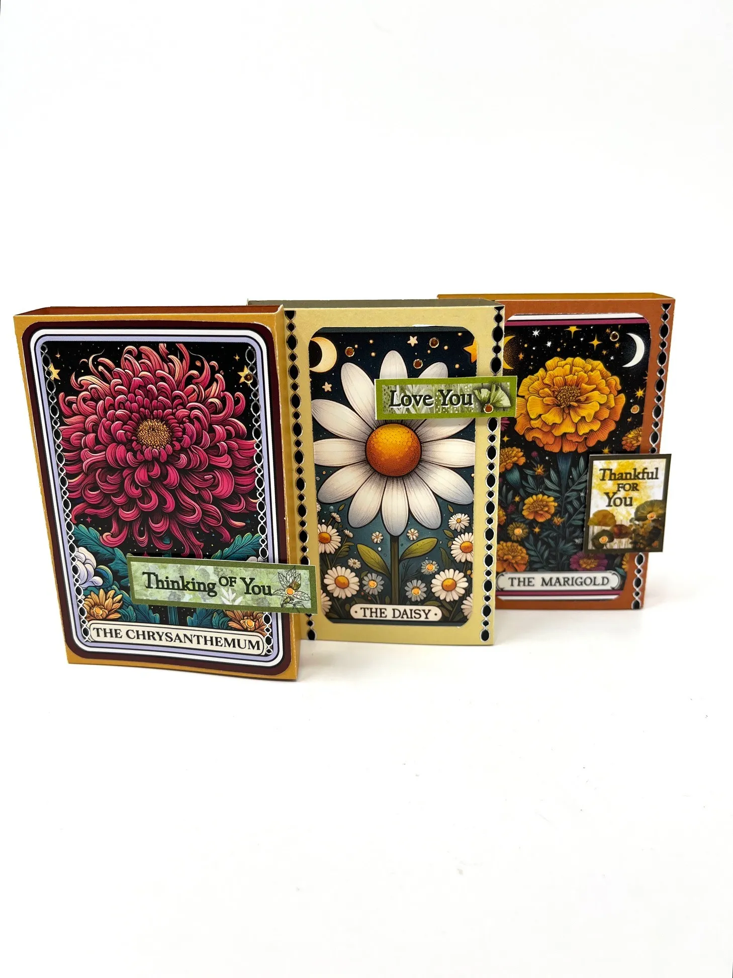 Die-cut three colors of Golden Botanicals 12x12 solid cardstock using the Triple Box Card Cutting Die and assemble as per instructions on the package. Trim the “Chrysanthemum” to the maroon layer and round the corners using the R7 punch. Tape this to first box front on the far left. For the next two flowers, cut so they measure 1 3/4”x3 1/2”, punch the corners, and tape to the box fronts. Cut out and foam tape Golder Botanicals 6x6 sentiments as shown. Place black Oval Dazzles™️ as shown.