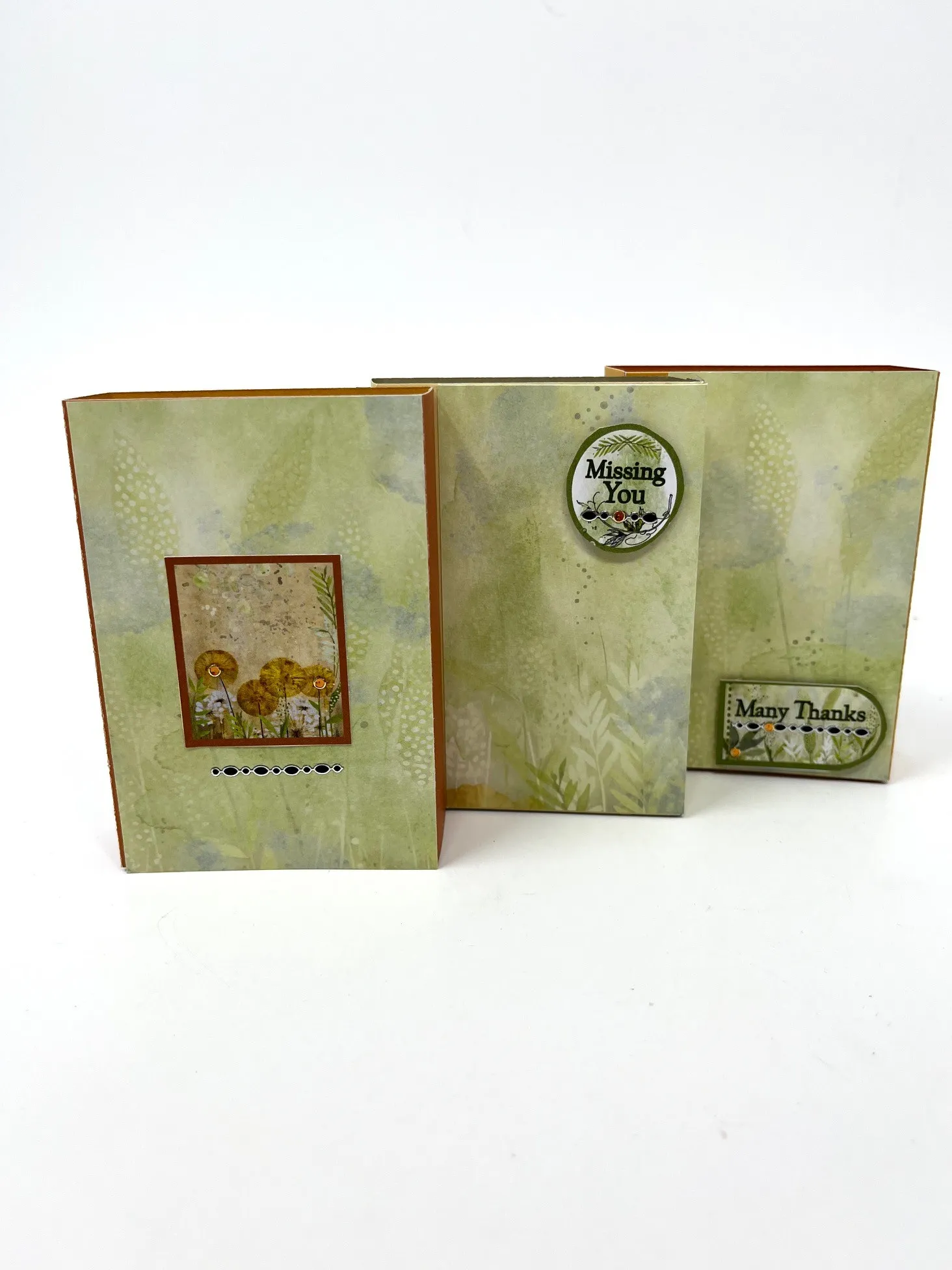 Card backside: For the first box on the left cut a 2 3/4”x4 green Golden Botanical patterned cardstock and tape to the surface. For the remaining boxes cut two 2 1/4”x4” pieces of the same cardstock and tape to surfaces. Cut out, glue and foam tape sentiments as shown. Place Dazzles™️ as shown.