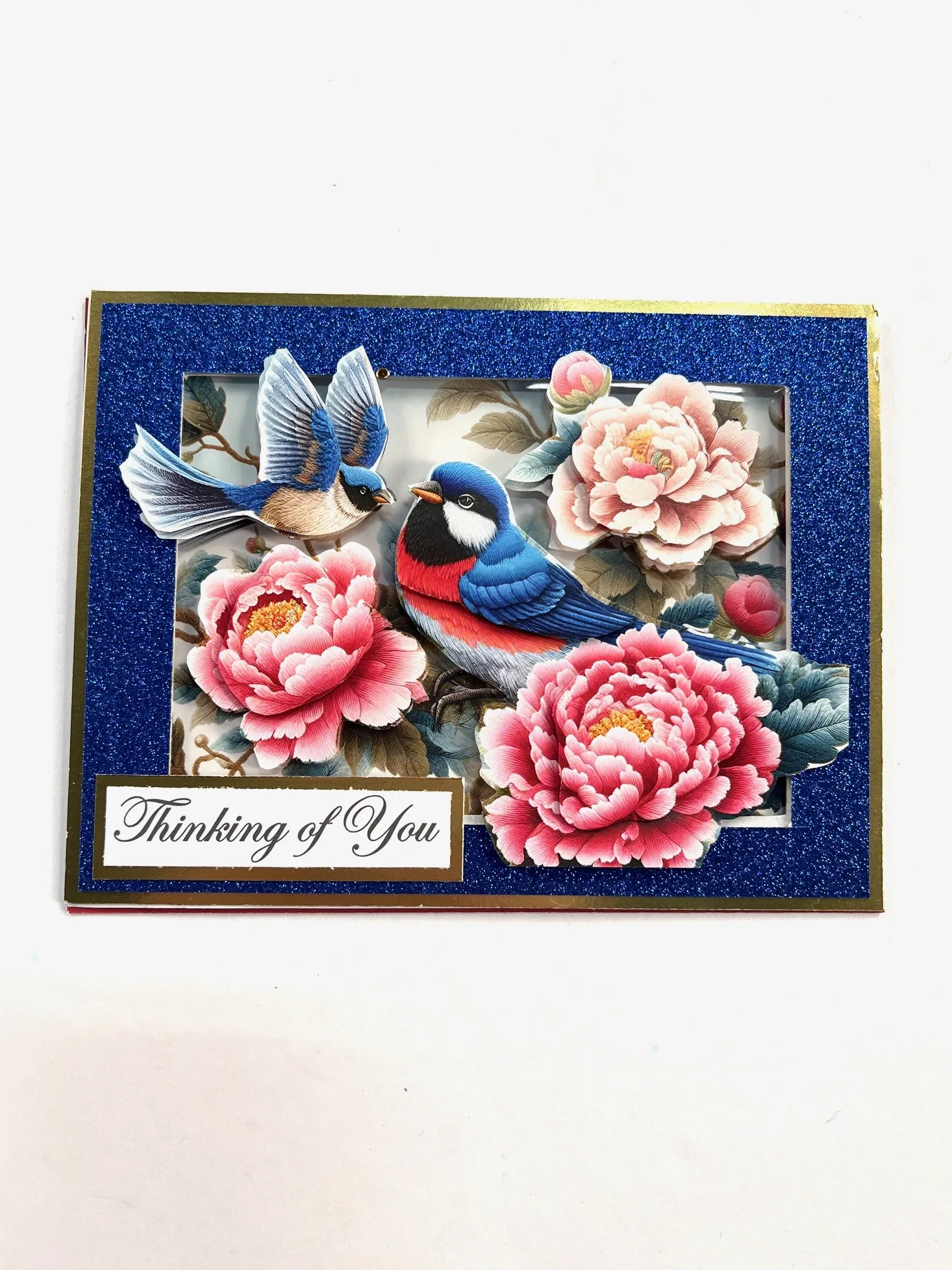 Cut apart a red cardinal sheet from the Little Book separating the images shown. Cut another layer of each image but just the center of the flowers, body of the flying bird and top of the other bird. Foam tape the pieces over the matching art. Trim 2 5/8”x5/8” Thinking of You from the Essential Inserts and mat on gold cardstock leaving a 1/8” gold border.