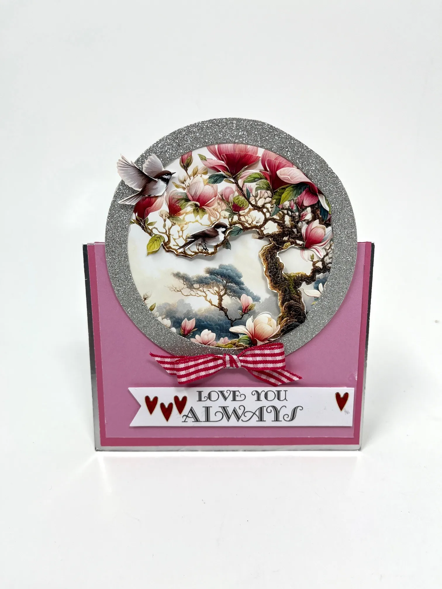 Make and Zot™️ a 2” wide gingham bow out of the Magenta/Pink Ribbon Set attaching it to the bottom of the tree. Cut 4”x3/4” Love You Always from Essential Inserts book and cut a “V” in the left end. Foam tape flush to right side and 1/2” from the bottom. Place heart Dazzles™️ as shown. Cut out the tree and foam tape over the matching art. Cut out the flying bird and the single bird then foam tape to the tree.