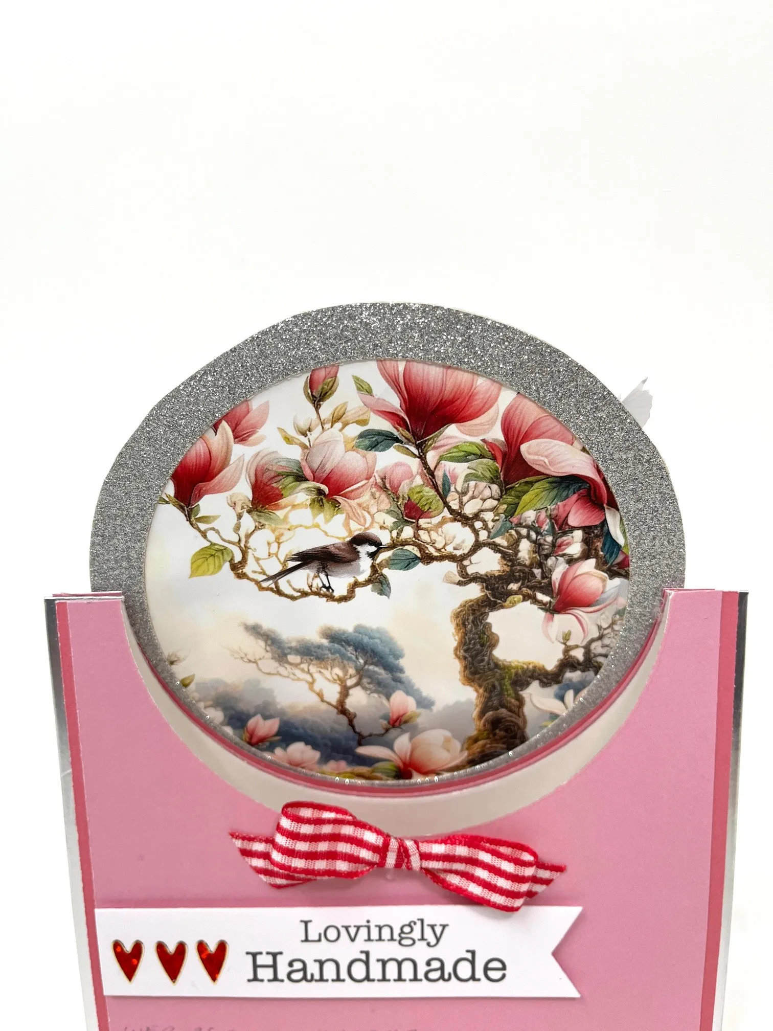 Backside: Repeat making a gingham bow and attaching it to the bottom of the circle. Cut “Lovingly Handmade”, cut the right end in a “V” and foam tape to the card. Add three heart Dazzles ™as shown.
