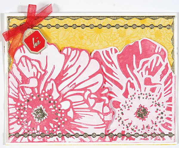 Place “hi” Silver Tiny Words & Phrases Dazzles™ on a Fresh Cut Foil Tags & Labels small tag and glue to the top left card corner. Use a length of red sheer Fresh Cut Ribbon to make a bow and Zot™ to the tag. Place silver glitter glue on the flower centers as shown and let dry.