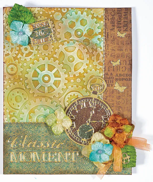 Front: Cut ivory cardstock to the same size as the Gears embossing folder and run though the embossing machine. Use the stylus and pad to apply peacock feathers and bundled sage randomly over the embossed paper. Repeat with the brown ink, giving the paper and antiqued look. Use the surface of the gold ink pad and place spots on ink on the raised areas. To create a color blocked effect, cut the embossed cardstock to 3 7/8”x4 ½” (saving the remainder for inside) and with your card with the fold on the left, glue the rectangle to the top left corner of the card. Glue 1”x4 ½” brown text Letterpress paper to the right edge and 5”x2” green tile paper across the card bottom. Ink the card edges brown.