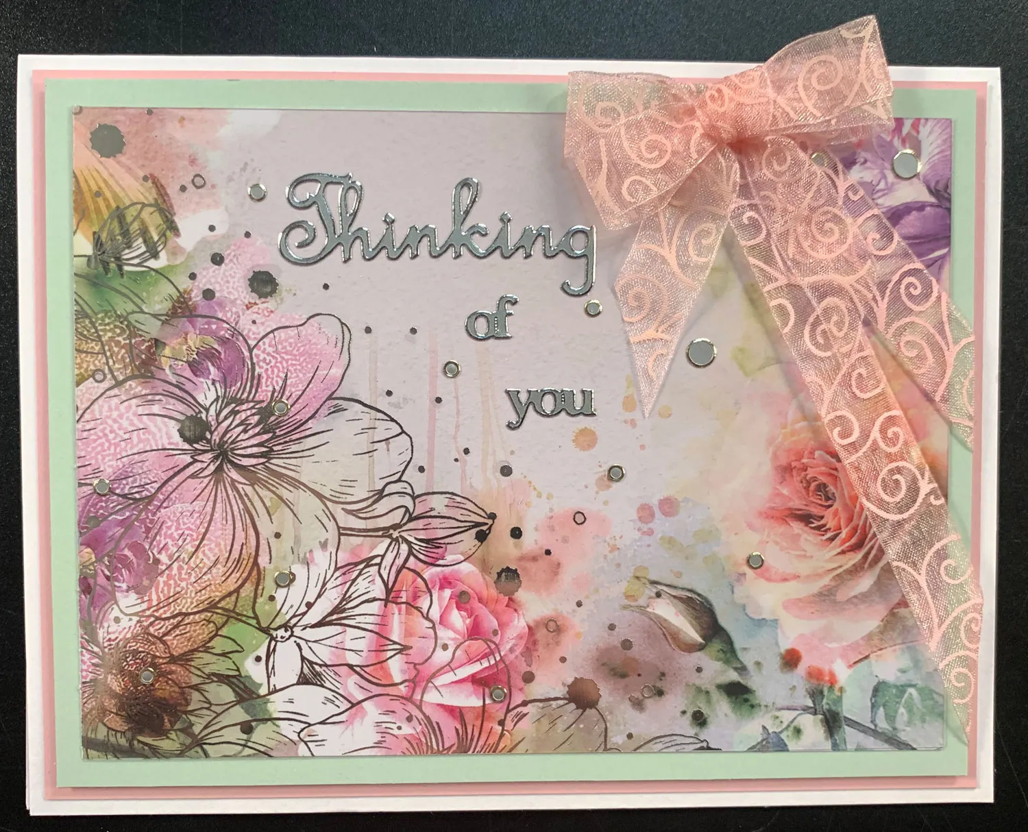 Trim the floral paper measuring 5 7/8”x4 1/4”. Cut a corresponding acetate to match but be sure you are cutting from the silver side of the acetate. Add Cosmic Specialist Glue drops behind the acetate dots and glue to the floral image. Mat on green Adorable Scorable with 1/8” borders. Wrap pink ribbon around the right side at 1/2” and 3” on the right and 2” from the top right corner. Foam tape and mat again on pink Adorable Scorable leaving a 1/8” border. Place Platinum Jewel Dazzles™ randomly onto the design. Glue bow to the top. Place the silver Dazzles™ greeting in the center.